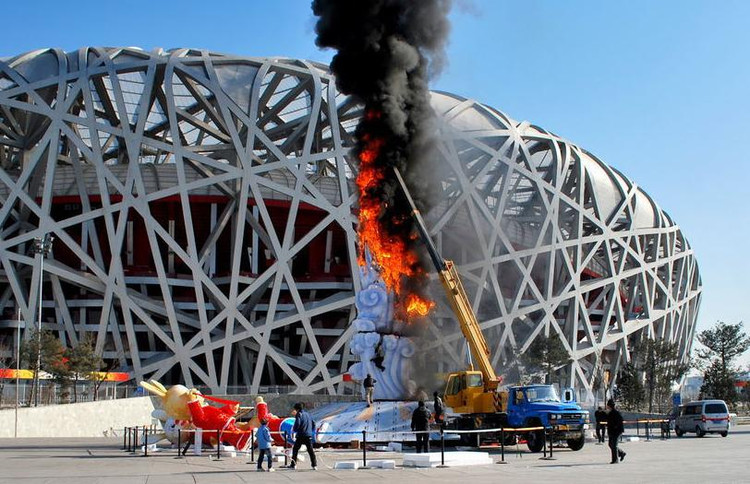 2011年1月24日中午12時,鳥巢西側(cè)一百米遠(yuǎn)處,一處三米高正在施工的“祥云玉兔”裝飾物底部“云彩”部分起火,被工作人員發(fā)現(xiàn)后迅速撲滅,濃煙引來近百名游客圍觀。據(jù)悉,事因工人施工中電焊引燃塑料泡沫。
