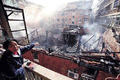 24日一早,筆者趕到事發(fā)現(xiàn)場時,現(xiàn)場已被警方警戒,以防止斷壁殘墻傷人。兩層的民房僅剩下四面孤立的磚墻,屋頂全被燒毀,木質的屋梁已燒成焦炭,還不時冒著白煙,幾個從大火中搶出的煤氣罐堆在一旁。消防人員正在收拾裝備,準備離開現(xiàn)場。