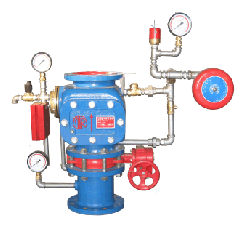 雨淋報(bào)警閥主要結(jié)構(gòu)為閥體、閥瓣、閥座、隔膜控制室及壓桿等。屬杠桿式控制閥。閥體材料為灰口鑄鐵,閥瓣、閥座、膜室蓋、控制室支持架均采用銅合金材料,壓桿軸、閥瓣軸及彈簧等采用不銹鋼材料,密封墊、控制室隔膜采用丁腈橡膠。閥瓣打開(kāi)后,壓桿在彈簧作用下旋轉(zhuǎn)一定角度支住閥瓣,使其不能關(guān)閉。滅火后,可用扳手在閥體外側(cè)旋轉(zhuǎn)復(fù)位,無(wú)需打開(kāi)閥體蓋進(jìn)行復(fù)位。