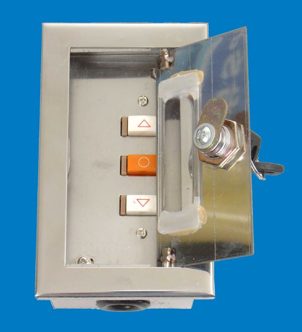 防火卷簾門控制按鈕用于防火卷簾門開閉功能,內(nèi)有上、停、下三個按鍵,分別控制卷簾門上、停、下;按鈕盒有三對常開、三對常閉觸點,可供用戶自由選擇;面板上有玻璃窗孔,緊急狀態(tài)下,可擊碎玻璃,啟動卷簾門。