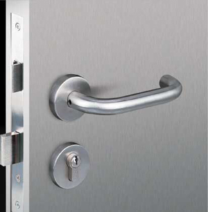 防火門專用鎖,包括鎖殼、鎖舌、旋鈕、鎖芯,其特征在于:鎖舌上有轉(zhuǎn)軸連接鎖殼,鎖舌上有撥塊,有一撥桿,撥桿為人字型,撥桿的中部有轉(zhuǎn)軸連接鎖殼,撥桿的頂端與鎖舌上的撥塊對(duì)應(yīng),撥桿中部有一外伸的撥叉,撥桿的后部伸出鎖殼,鎖芯連接偏心桿,偏心桿與撥桿中部的外伸的撥叉相對(duì)應(yīng),旋鈕上連接一偏心桿,偏心桿與撥桿中部相對(duì)應(yīng)能在發(fā)生火災(zāi)等危機(jī)情況時(shí)及時(shí)打開(kāi)門鎖,而又能用鑰匙、旋鈕鎖定門鎖。