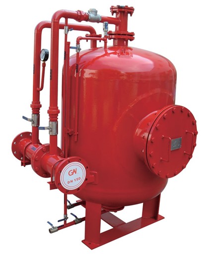 當(dāng)壓力水流經(jīng)比例混合器時(shí)一部分壓力水(3%-6%)由支管進(jìn)入泡沫液儲罐內(nèi)擠壓膠囊,置換出等量的泡沫液與另一部分水(97%-94%)在比例混合器內(nèi)混合成泡沫混合液提供給泡沫產(chǎn)生裝置,產(chǎn)生空氣泡沫進(jìn)行滅火。